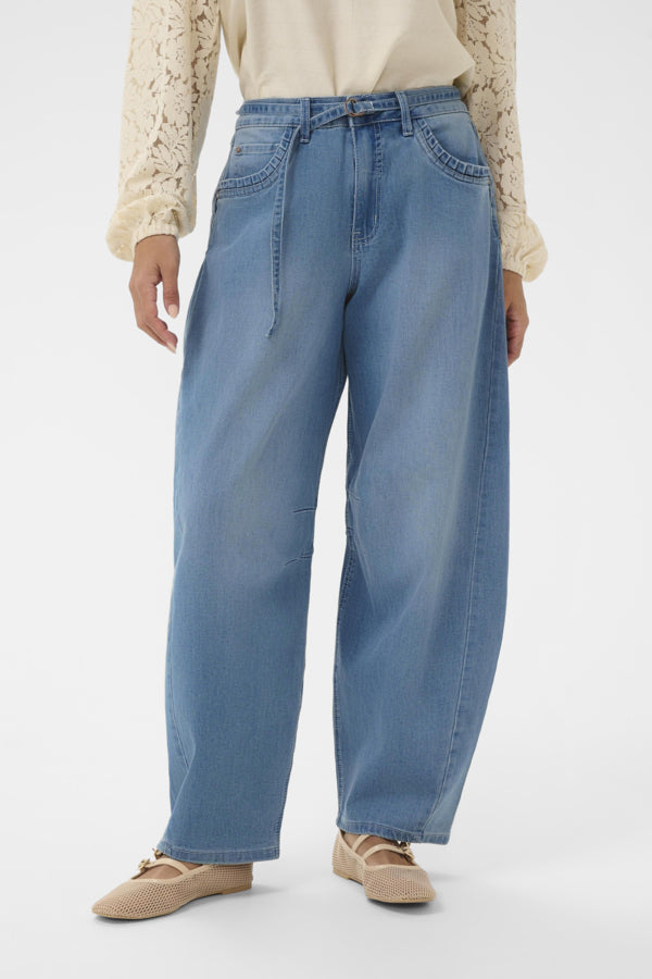 Wide leg jeans feature a comfortable loose fit with a relaxed waist and straight silhouette. Classic five-pocket design and subtle belt accent bring versatile styling for casual or smart-casual occasions.