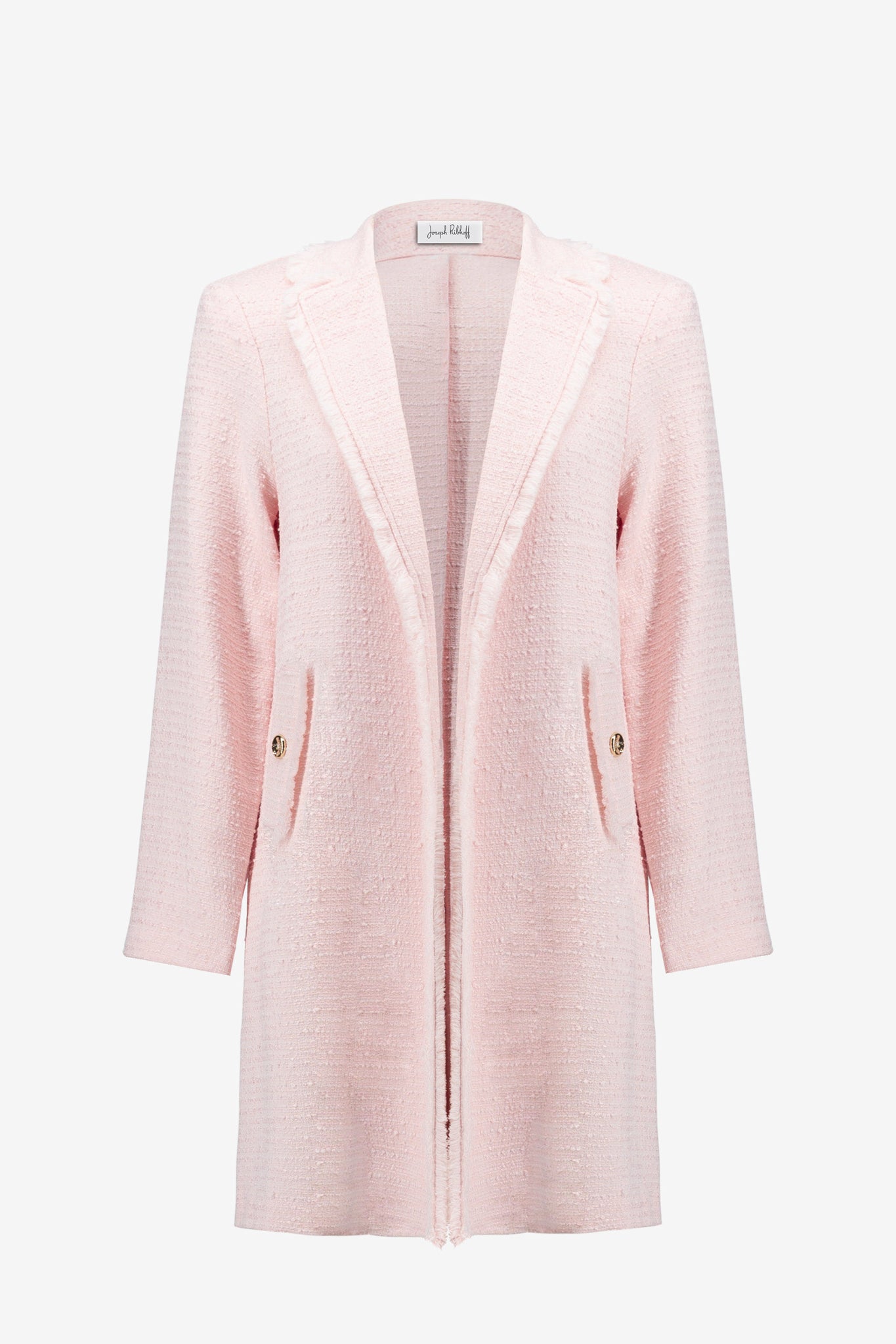 Timeless with a touch of texture, this bouclé coat features a classic notched collar, an open front with soft fringe trim, and faux welt pockets adorned with gold textured buttons.