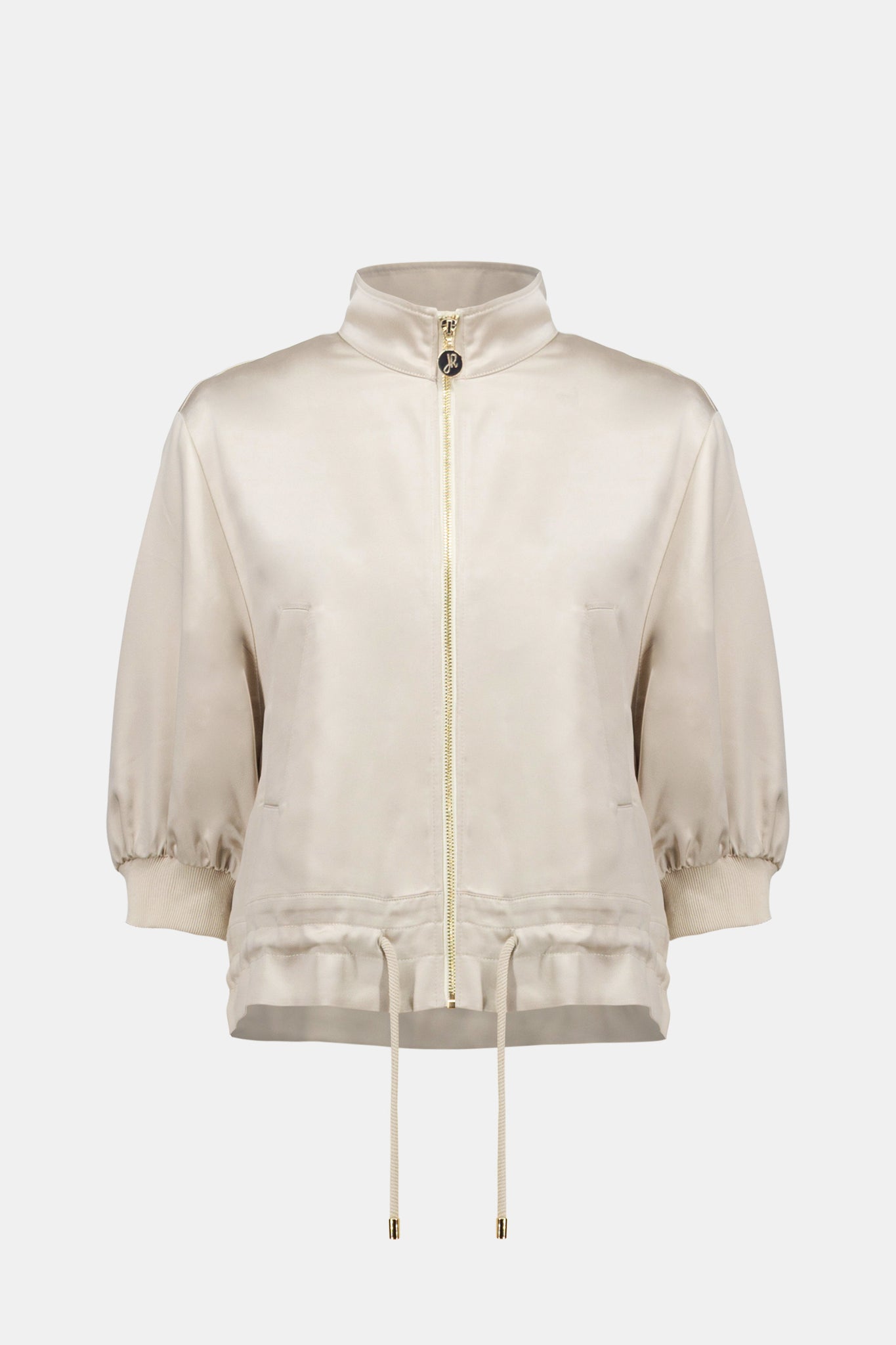 This satin boxy blouson jacket features a funnel neck collar, drop shoulder three-quarter sleeves with ribbed cuffs, and a drawstring hem. Finished with a metal zipper front closure and faux pockets, it offers a modern, relaxed fit.