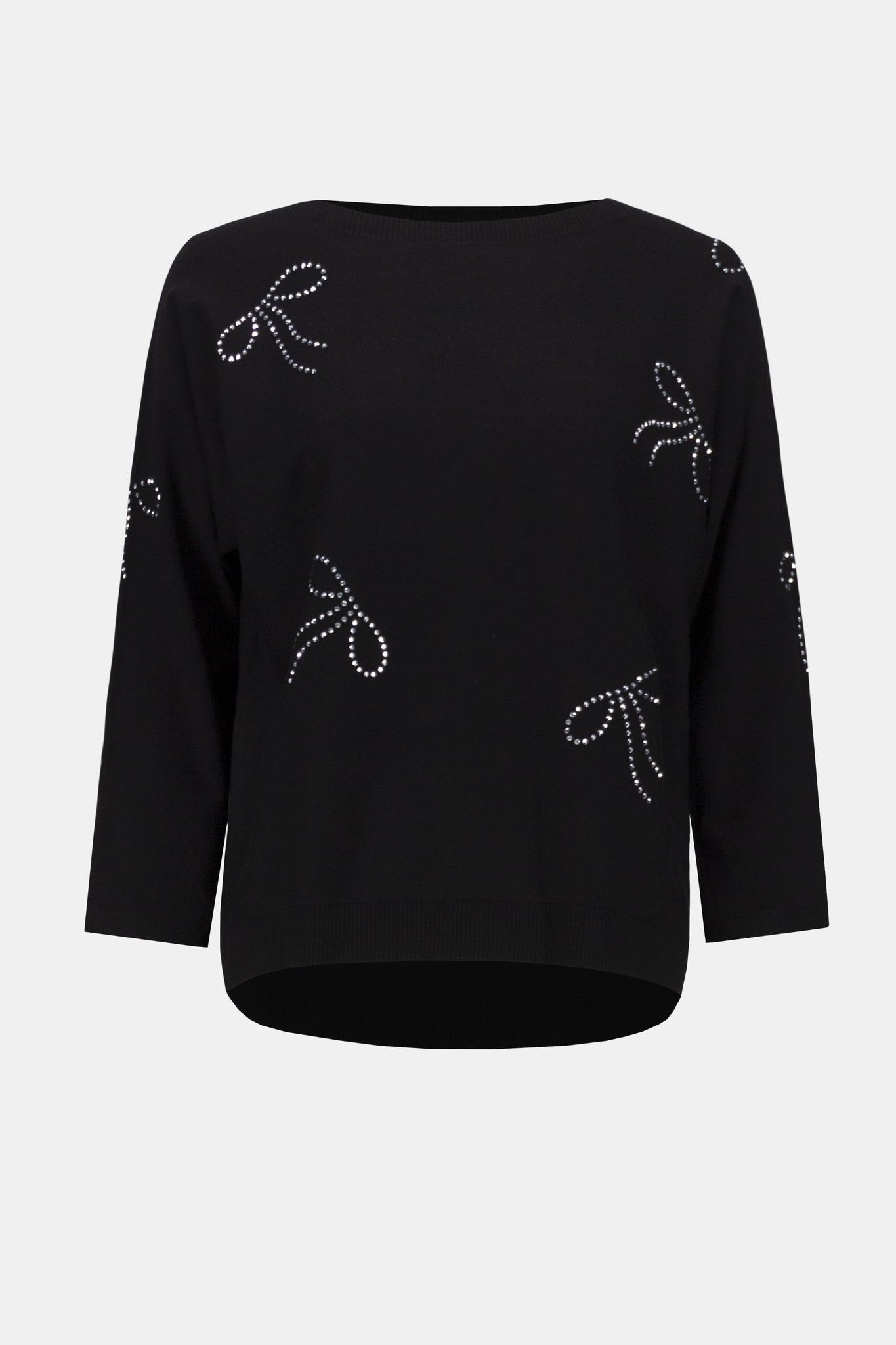 Delicate bow details add a stylish twist to this cozy sweater knit pullover. Framed by a flattering boat neckline, three-quarter sleeves, and a chic high-low hem, this charming piece blends comfort with elegance.